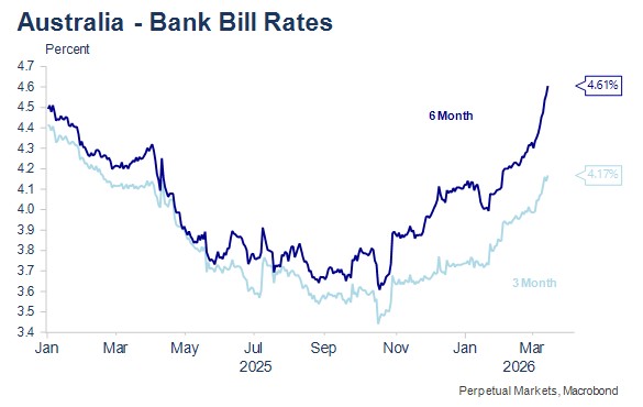 Short-term interest rate markets have been interesting. Market pricing for US interest rate cuts has been reduced and pushed further out, while in Australia, the reverse has occurred, with interest rate rise timing brought forward and increased. At the end of last week, the US market was pricing a full rate cut only by March 2027, compared to previous week’s pricing of two rate cuts by July this year. In Australia, where the market previously discounted two rate increases by November this year, there are now nearly three rate increases priced this year, with the next rate rise fully priced for May. This saw a 20 basis point increase in 6-month bill yields over the past week, but even then, the probability of a move at this week’s March Board meeting of around 70% seems a little under-priced.